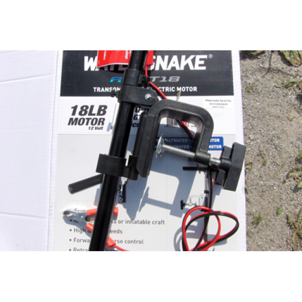 Фиксация такого электромотора для надувных лодок в рабочем положении осуществляется с помощью защёлки. Регулировка угла наклона дейдвуда не предусмотрена. Чтобы уложить двигатель в транспортное положение необходимо вынуть трубу дейдвуда из фиксатора. Румпель управления выдвигается из корпуса. Модель WaterSnake T18 предназначена для эксплуатации в пресной воде.